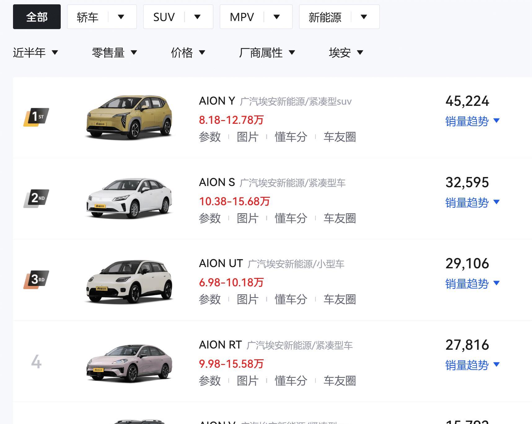 从近半年的销售数据来看,埃安的主力车型依旧是AION Y系列,另外新推出的AION UT销量增长势头很猛,作为一款纯电小车,AION UT的空间较大,也有不错的性价比;而刚刚发布的AION RT焕新版,小宅认为“性价比”其实相对一般,除了全系标配宁德时代电池,这款车型的其他配置并不算出色。