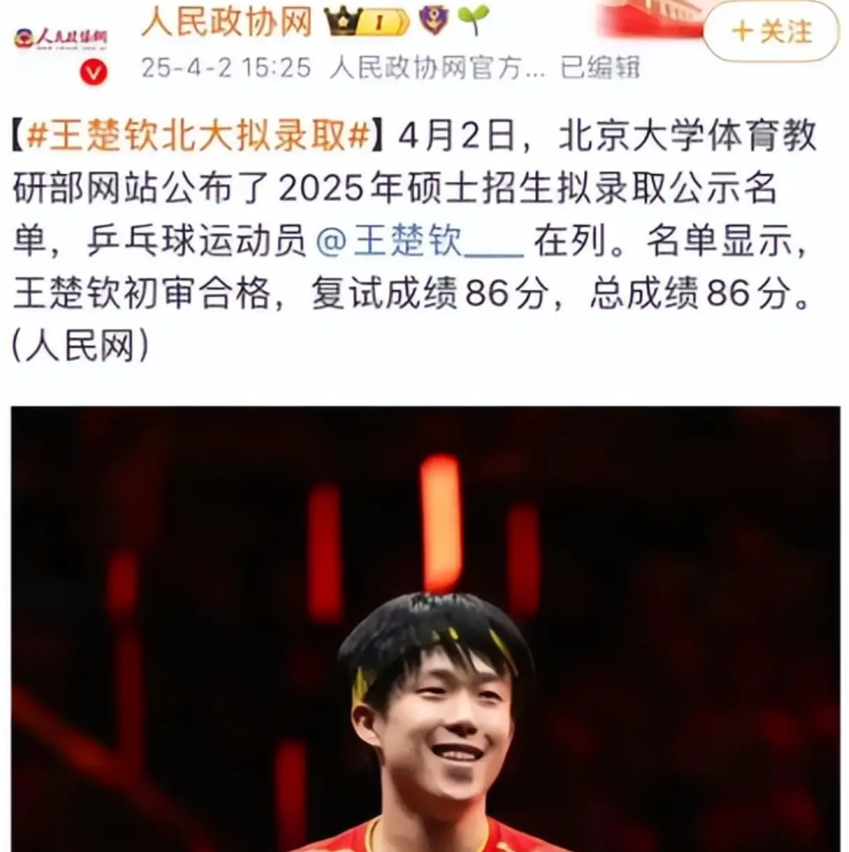 同样刚刚结束澳门赛程的王楚钦,也已正式成为北京大学体育教研部的研究生。